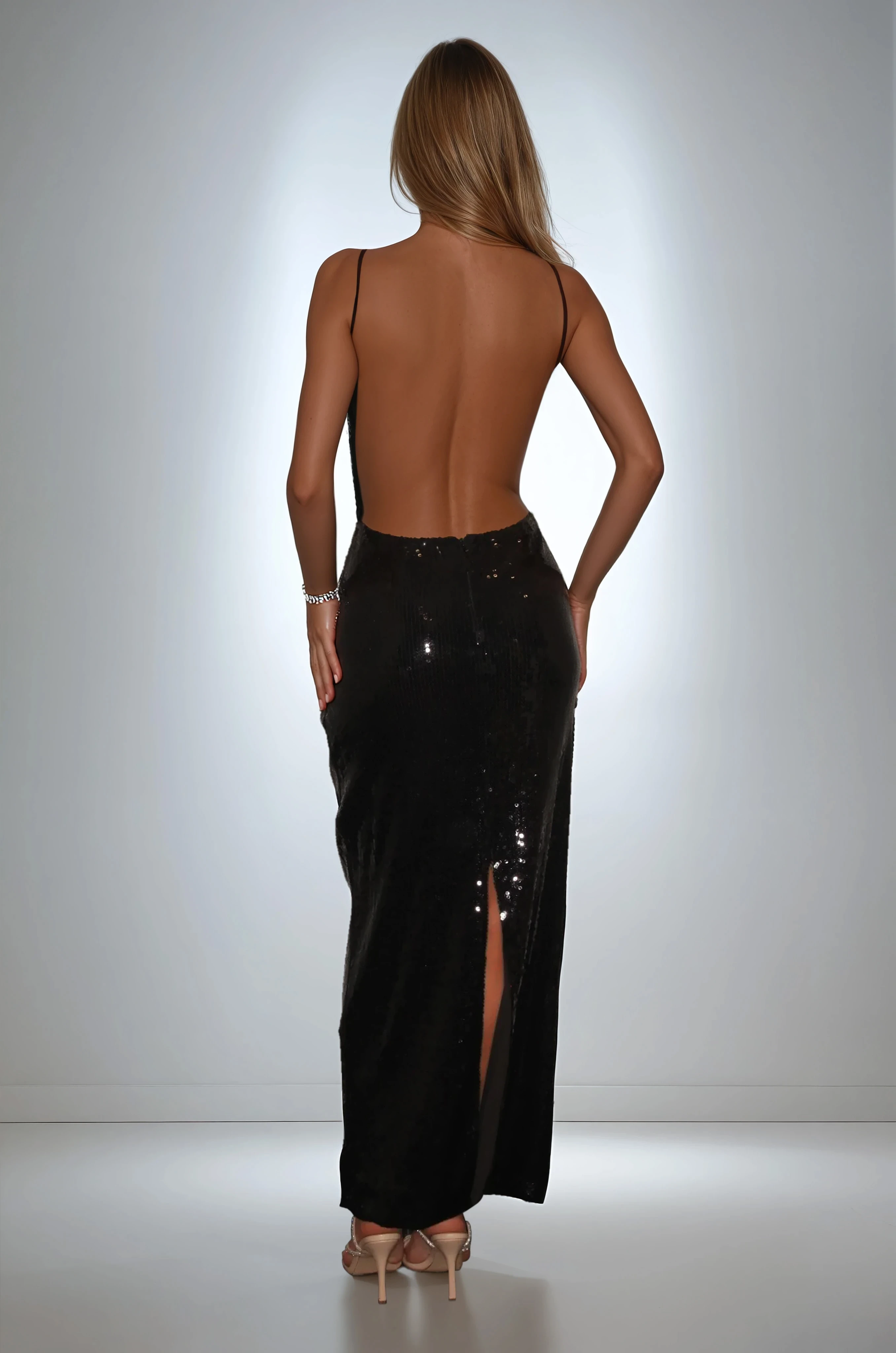 Make a striking entrance in this sultry black sequin maxi dress, designed to captivate from every angle. Featuring a plunging halter neckline and a dramatic open-back silhouette, this floor-length gown hugs the body with a sleek, figure-enhancing fit. The shimmering sequin fabric catches the light beautifully, while the minimalist straps and elegant cut deliver a high-fashion, red-carpet feel. Perfect for formal events, evening galas, or luxury parties, this dress is the ultimate statement of modern glamour and confidence.