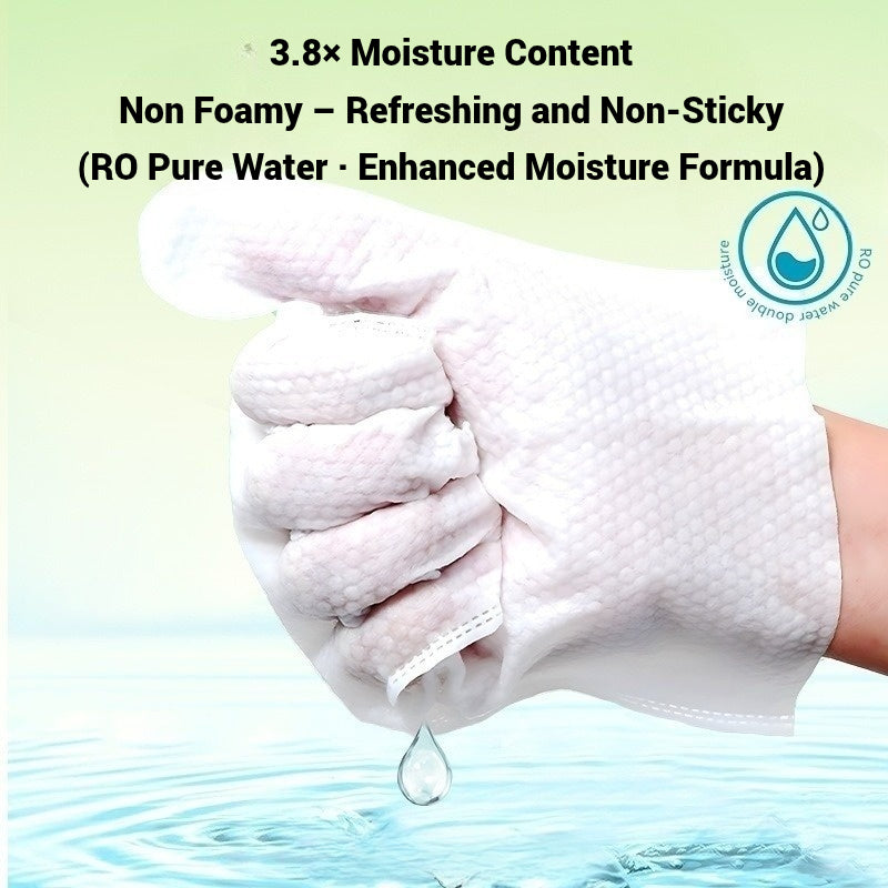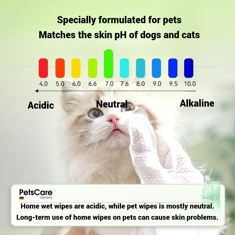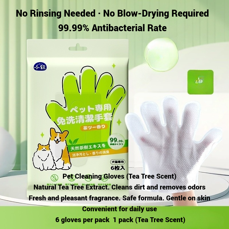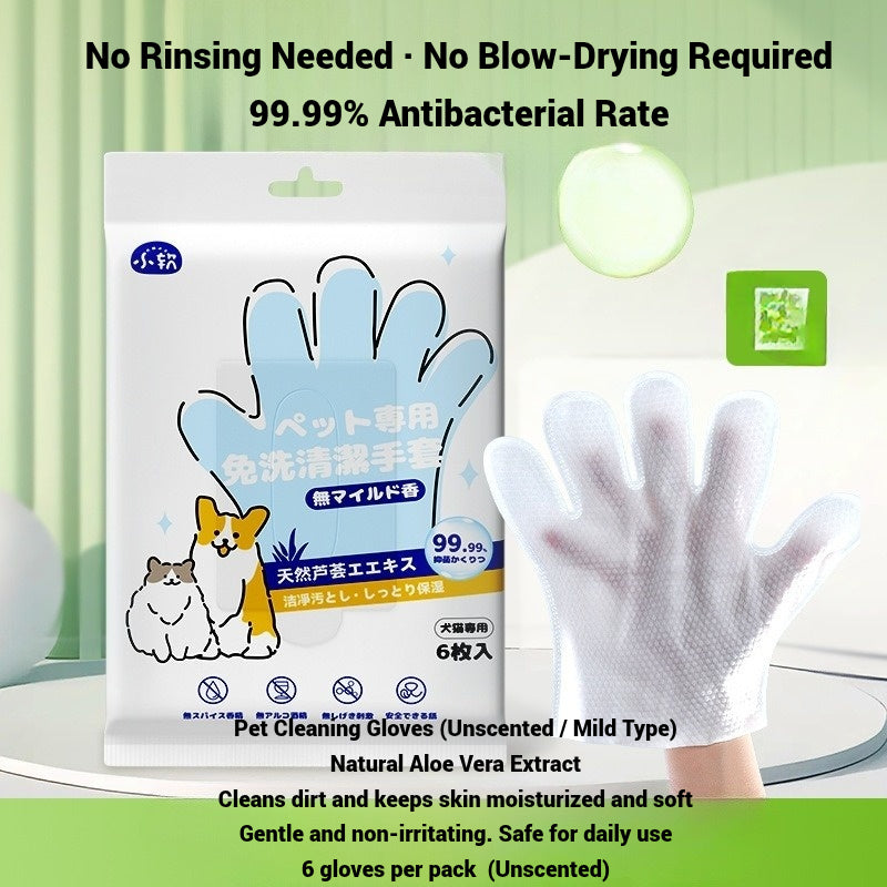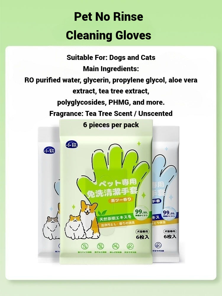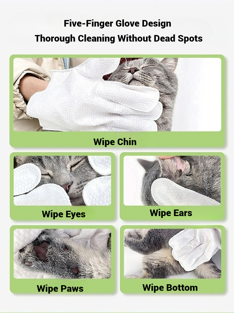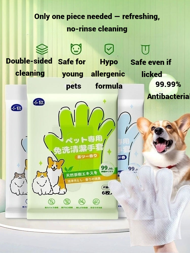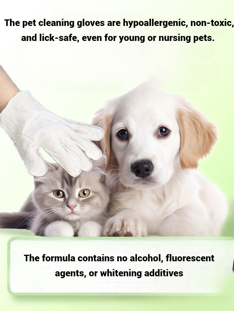The product is a pair of disposable cleaning gloves for pets, designed to clean their fur or paws without the need for water — safe for puppies and kittens, gentle on skin, and antibacterial.